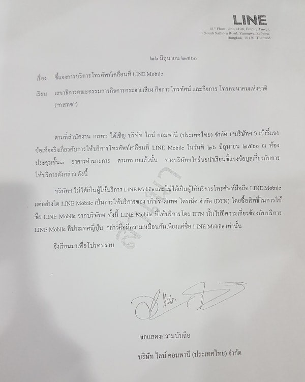 LINE ส่งหนังสือชี้แจง กสทช. ในประเด็นเรื่อง “LINE MOBILE เข้าข่าย MVNO หรือไม่? ” เนื้อหาโดยสรุปว่า บริษัท LINE ทั้ง LINE ประเทศไทย และ LINE ประเทศญี่ปุ่น ไม่ได้เป็นผู้ให้บริการ LINE MOBILE ประเทศไทย และไม่ได้เป็นผู้ให้บริการโทรศัพท์เคลื่อนที่ LINE MOBILE ในประเทศไทย แต่บริการดังกล่าวเป็นการให้บริการของ DTN (DTAC) ที่ซื้อลิขสิทธิ์ในการใช้ชื่อ LINE MOBILE เท่านั้น ซึ่งเป็นการซื้อเพียงชื่อสำหรับการให้บริการเท่านั้น
