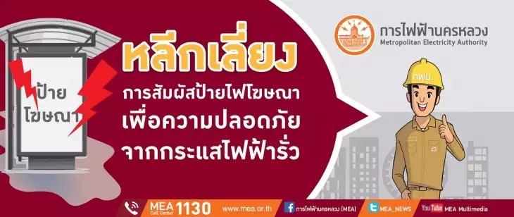 นายจาตุรงค์ สุริยาศศิน ผู้อำนวยการฝ่ายสื่อสารองค์กร การไฟฟ้านครหลวง (กฟน.) เปิดเผยว่า กฟน. มีความห่วงใยประชาชนในช่วงเทศกาลปีใหม่ แนะนำให้ระมัดระวังหลีกเลี่ยงการสัมผัสป้ายโฆษณาไฟฟ้าเพราะอาจเกิดกระแสไฟฟ้ารั่วทำให้ไฟฟ้าดูดมีอันตรายแก่ชีวิตได้