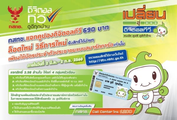 กสทช. ประกาศแจกคูปองดิจิตอลทีวี 690 บาท จำนวน 3.98 ล้านราย ล็อตใหม่วิธีการใหม่ ง่ายขึ้นแค่พกบัตรประชาชนแบบสมาร์ทการ์ด ภายในวันที่ 2 มีนาคม – 2 กันยายน 2560 เพื่อสนับสนุนประชาชนในการเปลี่ยนผ่านไปสู่การรับชมดิจิตอลทีวี