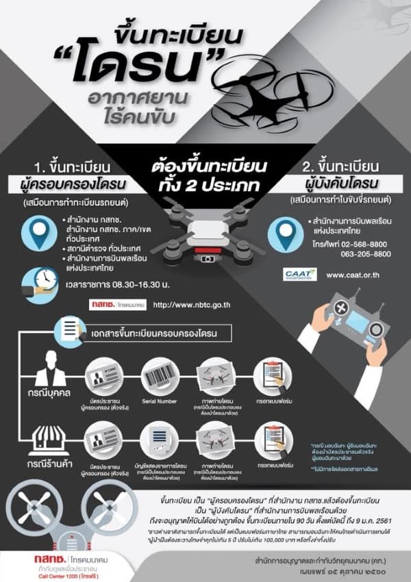 - การข้อขึ้นทะเบียนโดรน ต้องขอขึ้นทะเบียนทั้ง 2 หน่วยงานคือ สำนักงานการบินพลเรือนแห่งประเทศไทย (กพท. , CAAT) และ สำนักงาน กสทช.