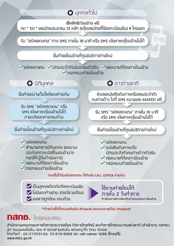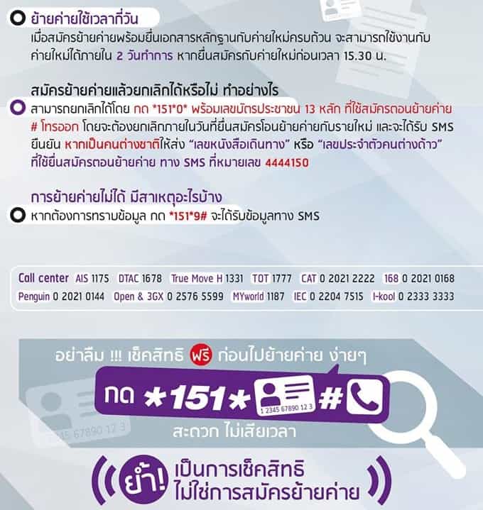 ง่ายๆเพียง กด * 151*ตามด้วยหมายเลขบัตรประชาชน # แล้วกดโทรออก เพื่อป้องกันข้ออ้างของผู้ให้บริการมือถือที่ไม่ให้ย้ายค่าย และการย้ายค่าย เบอร์เดิม จะสะดวกรวดเร็วมากขึ้นภายใน 2 วันทำการ โดยเริ่มใช้งานระบบใหม่ 20 มกราคม 2560 เป็นต้นไป