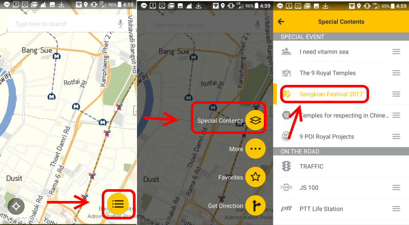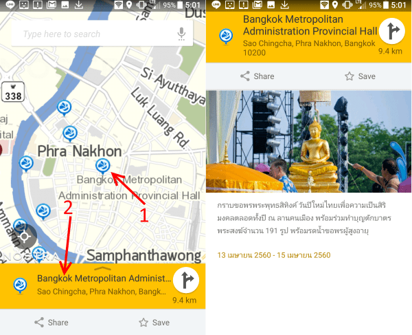 คราวนี้เราก็แตะหมุดสีฟ้า เพื่อแสดงรายละเอียดกิจกรรมสงกรานต์ ตามจุดต่างๆ พร้อมสามารถนำทางด้วย GPS ได้เลย หากคุณใข้คอมพิวเตอร์ สามารถคลิกที่ https://map.nostramap.com/NostraMap/?layer=songkran2017 เพื่อดูสถานที่จัดกรรมสงกรานต์ได้
