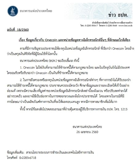 เมื่อวันที่ 26 เมษายน 2560 ธนาคารแห่งประเทศไทย ได้ออกประกาศแจ้งเตือนประชาชน ระวังตกเป็นเหยื่อการเชิญชวนให้ร่วมลงทุนกับสกุลเงินดิจิทัลที่ใช้ชื่อว่า OneCoin ซึ่งดูเข้าข่ายแชร์ลูกโซ่ โดยธนาคารแห่งประเทศไทยได้ชี้แจงดังนี้