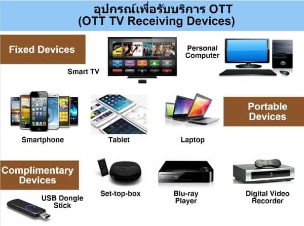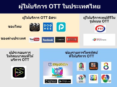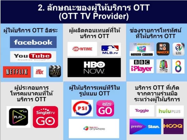ผู้ให้บริการ OTT ในประเทศไทยแบ่งออก ได้เป็น 4 กลุ่มใหญ่ คือ