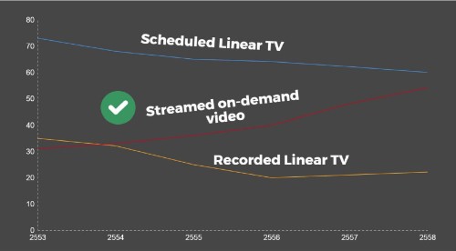 แนวโน้มการรับบริการกระจายเสียงหรือโทรทัศน์ผ่านโครงข่ายอื่นที่มิใช่โครงข่ายกระจายเสียงหรือโทรทัศน์ เช่น on-demand video (ได้แก่ YouTube คลิปวีดีโอสั้น ภาพยนตร์ และซีรีส์) มีแนวโน้มเพิ่มสูงขึ้นอย่างต่อเนื่องทั่วโลก ในขณะที่การรับชม Linear TV ผ่านหน้าจอโทรทัศน์มีแนวโน้มลดลง