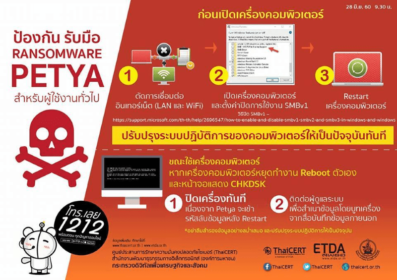 – ก่อนอื่นให้ปิดอินเทอร์เน็ต ทั้งถอด LAN และปิด WiFi จากนั้นเปิดเครื่องคอมพิวเตอร์เพื่อติดตั้งแพตซ์ หรือตั้งค่าปิดการใช้งาน SMBv1 แล้วทำการ Restart เครื่องคอมพิวเตอร์อีกครั้ง เพื่อปิดช่องโหว่สำหรับการระบาดของ PETYA