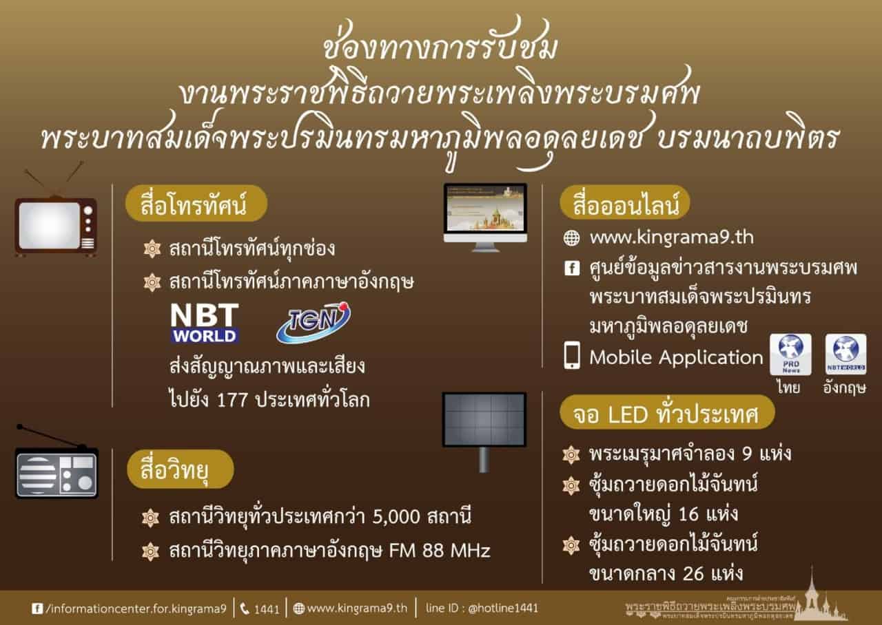 Facebook เพจ ศูนย์ข้อมูลข่าวสารงานพระบรมศพพระบาทสมเด็จพระปรมินทรมหาภูมิพลอดุลยเดช ได้โพสต์เกี่ยวกับช่องทางการรับชมถ่ายทอดสด พระราชพิธีถวายพระเพลิงพระบรมศพพระบาทสมเด็จพระปรมินทรมหาภูมิพลอดุลยเดช ซึ่งเริ่มถ่ายทอดสดตั้งแต่วันที่ 25-29 ตุลาคม 2560 โดยสามารถชมได้ทั้งช่องทางที่ทางเพจประกาศ และช่องทางอื่นเพิ่มเติมดังนี้