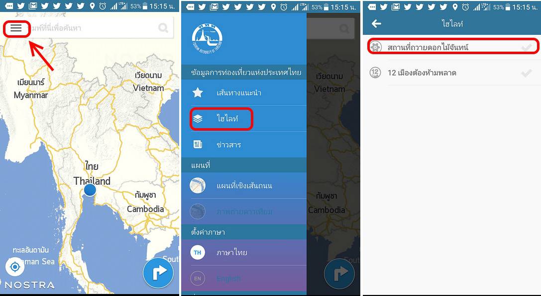 โดยขั้นตอนดูว่า สถานทีี่จัดพิธีถวายดอกไม้จันทน์ที่จะมีขึ้นในวันที่ 26 ตุลาคม 2560 มีที่ไหนบ้าง ก็เปิดแอป Thailand Tourism Maps ทัั้งบน iOS หรือ Android จากนั้นเรียกเมนูด้านซ้ายมือ แล้วเลือกที่ไฮไลท์ แล้วเลือกที่ สถานที่ถวายดอกไม้จันทน์ ดังรูปด้านบน