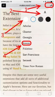 หากคุณแตะที่ปุ่ม Aa บริเวณมุมขวาของจอ Safari คุณสามารถปรับส่วนต่างๆไม่ว่าจะเป็นพื่้นหลังโทนสีต่างๆ แบบตัวอักษร ขนาดตัวอักษร ตามใจคุณ เพื่อให้คุณอ่านสบายตาขึ้น เหมาะสำหรับคออ่านเว็บ และผู้ที่อ่านเว็บบนสมาร์ทโฟนในช่วงกลางคืน