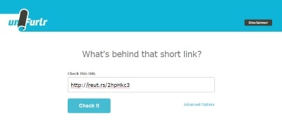 เว็บไซต์ unfurlr.com เป็นเว็บไซต์ที่สามารถสแกนเผยชื่อ URL เต็มๆว่าเมื่อคลิกแล้วไปเว็บไซต์ไหน พร้อมกับช่วยตรวจสอบว่าเว็บไซต์นั้นอันตรายหรือไม่ ยกตัวอย่างนำลิงค์ Short URL ใน twitter นี้มา copy ทดสอบหน่อย