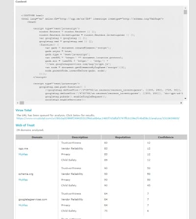 เลื่อนลงมาด้านล่างก็จะเห็นโค้ดต่างๆของหน้านั้น และผลการทดสอบการสแกนเว็บไซต์ว่าเว็บอันตรายหรือไม่ โดยทดสอบจากเว็บไซต์ Virustotal ซึ่งมีแบรนด์ Antivirus ถึง 43 แบรนด์ มาช่วยสแกนตรวจสอบในครั้งเดียวด้วย ดังนั้นมัลแวร์ในเว็บปลอมยากที่จะหนีรอด