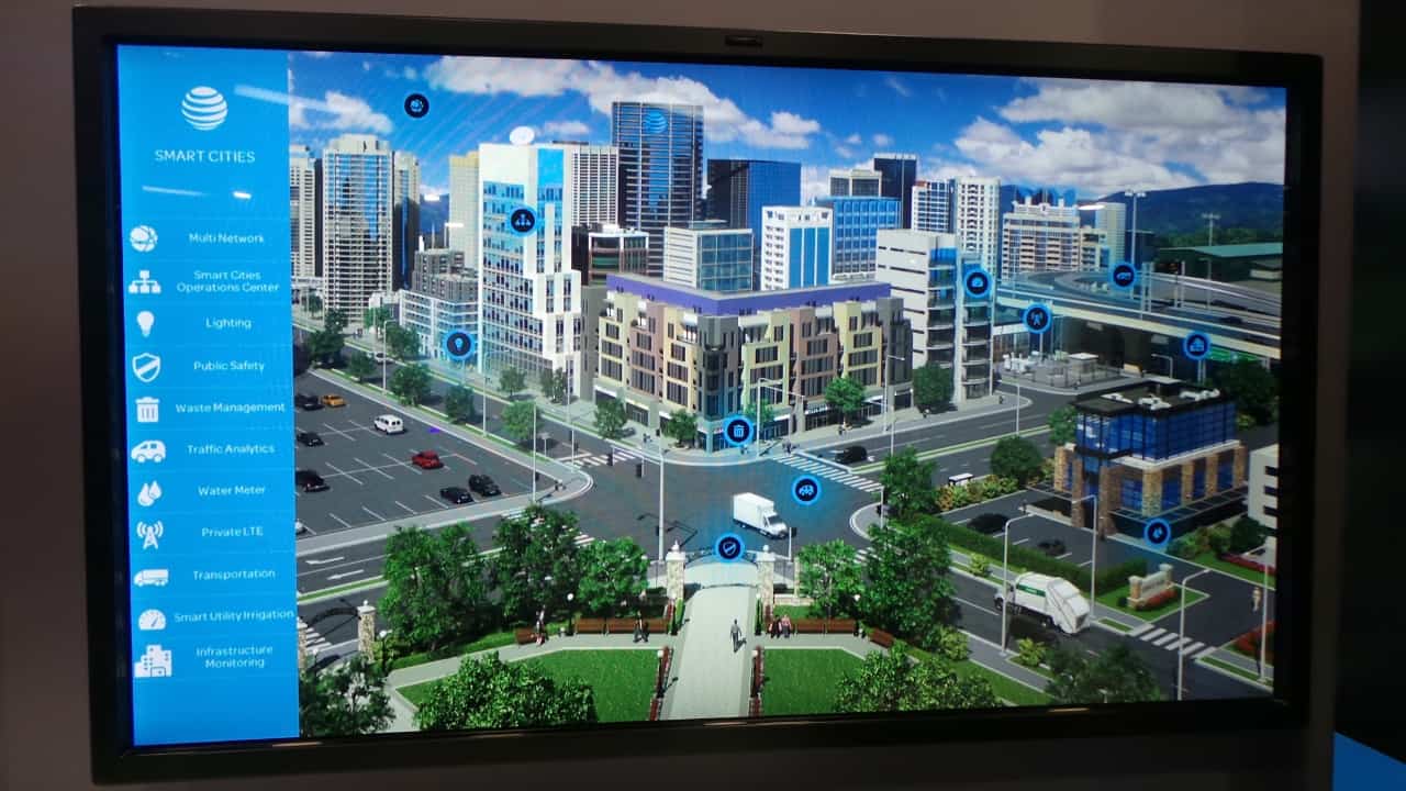 ที่สหรัฐอเมริกา ผู้ให้บริการโทรศัพท์มือถืออย่าง AT&T ก็ได้นำเสนอเรื่อง Smart City เช่นกันแต่นำเสนอระบบย่อยมากถึง 11 ระบบ ตามรูป