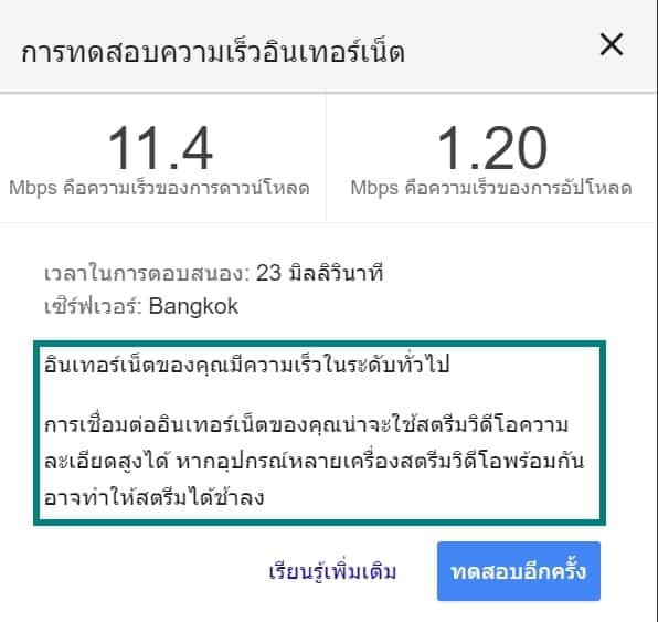 เมื่อทดสอบเสร็จแล้วจะแสดงผลความเร็วอินเทอร์เน็ตของคุณ และระบบวิเคราะห์ให้ด้วยว่าความเร็วอินเทอร์เน็ตที่คุณได้ เร็วมั้ย ทั่วไป หรือเน็ตช้าไป และความสามารถของเน็ตที่ท่านใช้ให้ด้วย โดยตัวอย่างนี้ทดสอบผ่านทาง Wifi ผู้ให้บริการเจ้าหนึ่งซึ่งผลปรากฎว่าได้ความเร็วทั่วไป สามารถชมวีดีโอ HD ได้ แต่ถ้ามีอุปกรณ์สตรีมวีดีโอพร้อมกันจะได้ความเร็วเน็ตช้าลง