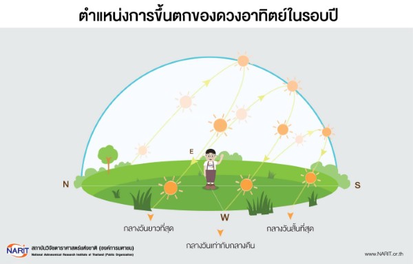 นายศุภฤกษ์ คฤหานนท์ หัวหน้างานบริการวิชาการทางดาราศาสตร์ กล่าวว่า ช่วงเดือนมิถุนายนดวงอาทิตย์ตกค่อนข้างช้า กว่าจะตกลับขอบฟ้าก็เป็นเวลาใกล้หนึ่งทุ่ม เนื่องจากเป็นเดือนที่ประเทศทางซีกโลกเหนือได้รับปริมาณแสงจากดวงอาทิตย์นานที่สุดในรอบปี เกิดจากการที่โลกหมุนรอบตัวเอง (ใช้เวลาประมาณ 1 วัน) ขณะเดียวกันโลกก็โคจรรอบดวงอาทิตย์ (ใช้เวลาประมาณ 1 ปี) และเนื่องจากแกนโลกเอียงทำมุม 23.5 องศากับแนวตั้งฉากกับแนวโคจรรอบดวงอาทิตย์ ส่วนของโลกที่หันเข้าหาดวงอาทิตย์จึงแตกต่างกันไป รวมถึงรังสีดวงอาทิตย์ที่ตกตั้งฉากกับพื้นโลกก็เปลี่ยนไปตามช่วงเวลาของแนวทางการโคจร ทำให้ส่วนต่างๆ ของโลกได้รับแสงอาทิตย์ไม่เท่ากันและมีอุณหภูมิต่างกัน เป็นสาเหตุของการเกิดฤดูกาล ซึ่งในวันที่ 21 มิถุนายนนี้ ดวงอาทิตย์จะขึ้นทางทิศตะวันออกเฉียงไปทางเหนือมากที่สุดและตกทางทิศตะวันตกเฉียงไปทางเหนือมากที่สุด จึงเป็นวันที่มีช่วงเวลากลางวันยาวที่สุดในรอบปีของประเทศทางซีกโลกเหนือ ภาษาสันสกฤตเรียกว่า “วันครีษมายัน” (ครีด-ษะ-มา-ยัน) หรือ Summer Solstice สำหรับประเทศไทยในวันที่ 21 มิถุนายน 2560 ดวงอาทิตย์จะขึ้นจากขอบฟ้าทางทิศตะวันออกเฉียงเหนือเวลาประมาณ 05:51 น. และตกลับขอบฟ้าทางทิศตะวันตกเฉียงเหนือเวลาประมาณ 18:47 น. ดวงอาทิตย์ปรากฏอยู่บนท้องฟ้าเป็นเวลารวมกว่า 12 ชั่วโมง 56 นาที (เวลา ณ กรุงเทพมหานคร)