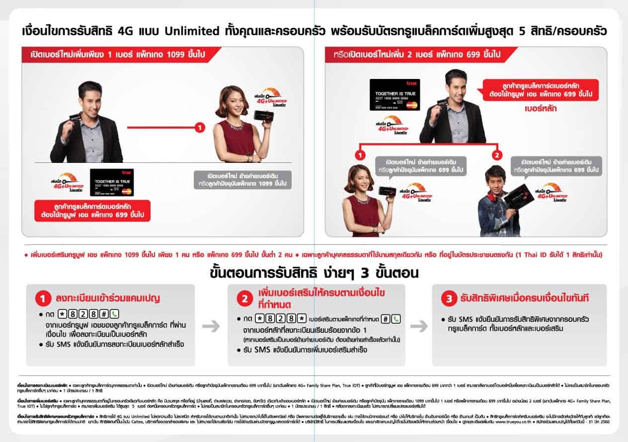- สมาชิกในครอบครัวอย่างน้อย 2 คน เปิด แพคเกจรายเดือน 699 บาทขึ้นไป คนละเบอร์ รวมเป็น 2 เบอร์ ได้รับบัตร True Black Card เพิ่ม 1 ใบ / เบอร์