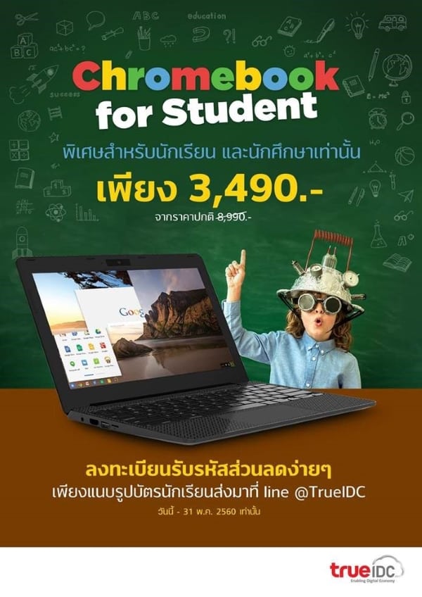 ใครที่อยากได้คอมพิวเตอร์โน้ตบุ๊ค สำหรับศึกษาหาความรู้ พิมพ์งานละก็ True IDC ร่วมเป็นส่วนหนึ่งในการสนับสนุนภาคการศึกษา เปิดโอกาสการให้เยาวชนได้เรียนรู้การใช้งานเทคโนโลยีคลาวด์เพื่อประยุกต์ใช้กับการเรียนให้ก้าวทันยุคสมัย โดยนำ True IDC Chromebook จัดลดราคาพิเศษให้กับกลุ่มนักเรียน นิสิต นักศึกษา จากปกติ 8,990 บาท เหลือเพียง 3,490 บาท กลายเป็น Chromebook ราคาพิเศษที่ถูกที่สุดในไทยที่เคยมีมา