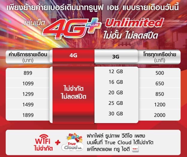 - สำหรับที่ย้ายค่ายจากค่ายอื่นๆ มาเป็น Truemove H แล้วสมัครแพ็ก 4G+ Unlimited ก็รับเน็ต 4G+ Unlimited ใช้เน็ต 4G ไม่อั้น ไม่ลดสปีดทันที โดยสมัครแพ็ก 899 บาท ขึ้นไป (ซึ่งหากดลือกโปรนี้แล้วจะไม่ได้โปรลดค่าบริการ 50%)