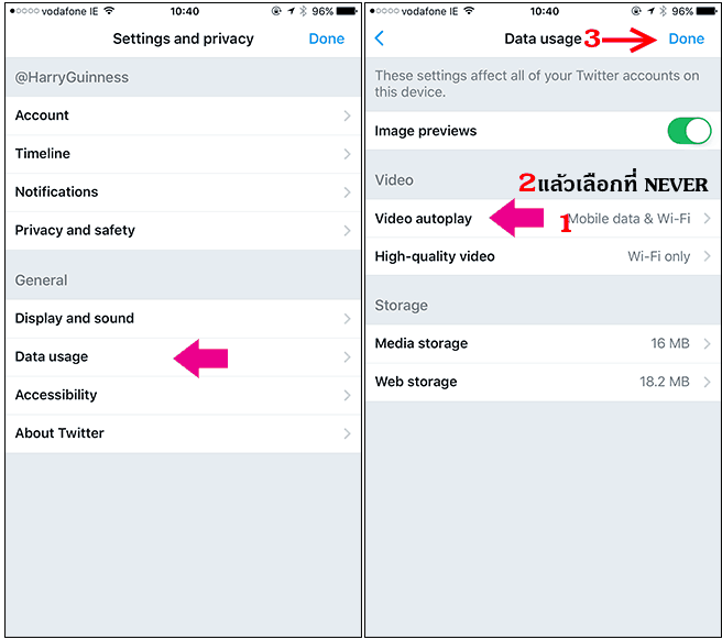 จากนั้นเลือก Data Usage >> เลือก Video Autoplay >> แล้วเลือกเปลี่ยนเป็น Never เสร็จแล้วคลิก Done แค่นี้ก็เสร็จเรียบร้อย ก็จะไม่เล่นวีดีโออัตโนมัติอีกและประหยัด 3G 4G ด้วย อย่าลืมตั้งค่าละ