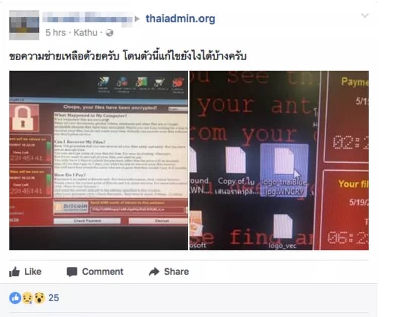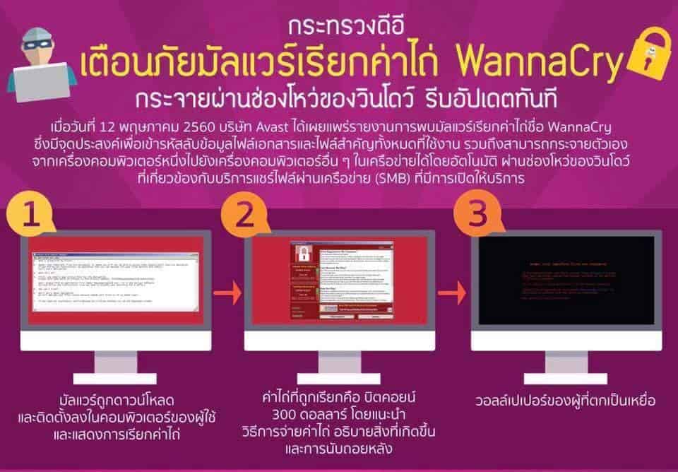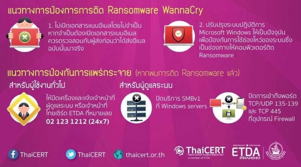 ทั้งนี้ กระทรวงดิจิทัลเพื่อเศรษฐกิจและสังคม และ ThaiCERT ก็ได้ออกประกาศเตือน ให้ระมัดระวัง มัลแวร์เรียกค่าไถ่ Wannacry แล้ว