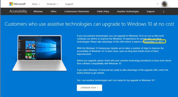 จากรายงานเก่าของ Windows 10 ที่เปิดโอกาสให้ผู้ใช้ Windows 7 , Windows 8.1 ได้อัปเกรดสู่ Windows 10 ฟรี หมดเขตการอัปเกรดฟรีเป็นที่เรียบร้อยแล้วเมื่อวันที่ 29 กรกฎาคม 2016 แต่ยังเปิดการอัปเกรดสู่ Windows 10 อยู่สำหรับคนพิการและคอมที่รองรับ Assistive Technology เพื่อให้เวลาการปรับตัวฟีเจอร์ Accessibility ที่เน้นสำหรับการใช้งานของผู้พิการ ล่าสุด Microsoft เปลี่ยนข้อตกลงว่าผู้ใช้ Windows รุ่นเก่าที่มีฟีเจอร์ด้านการเข้าถึง สามารถอัปเกรดสู่ Windows 10 ฟรี ได้ถึงสิ้นปี 2017 นี้เท่านั้น