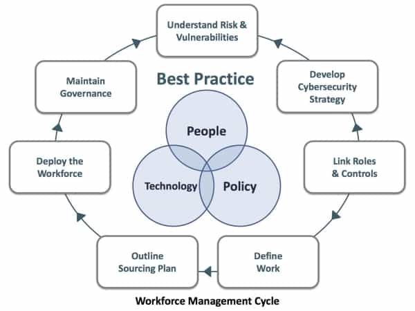 องค์กรทุกขนาด ทุกภาคส่วน ไม่ว่าจะเป็นภาคเอกชน และภาครัฐ มีความจำเป็นที่จะต้องปกป้องทรัพย์สิน ระบบ และโครงสร้างพื้นฐานด้านดิจิทัล โดยองค์กรจะต้องมียุทธศาสตร์และกลยุทธ์ความมั่นคงปลอดภัยไซเบอร์ที่มีประสิทธิภาพ (Effective Cybersecurity Strategy) และจะต้องมีแผนบริหารทรัพยากรบุคคลที่ดี โดยขั้นตอนไปสู่ความสำเร็จจะต้องมีการออกแบบวงจรการขับเคลื่อนที่ยั่งยืนและเหมาะสม โดยเอกสาร Cybersecurity Workforce Handbook ของ Council on Cybersecurity, Department of Homeland security ของสหรัฐอเมริกา ได้เสนอแนะวงจรการบริหารทรัพยากรบุคคลด้านความมั่นคงปลอดภัยไซเบอร์ โดยแต่ละขั้นตอนประกอบไปด้วย การปฏิบัติขั้นพื้นฐานที่องค์กรกำหนดขึ้น และจะต้องสอดคล้องกับกระบวนการและกรอบความคิดทางยุทธศาสตร์ และกลยุทธ์ขององค์กร