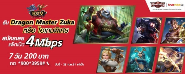 สรุปง่ายคือ ซื้อแพ็กเสริม ROV รับฟรี! กล่องทรูมูฟ เอช Epic Warriors เล่น RoV เต็มสปีด ไม่อั้น นาน 7 วัน 200 บ. (ความเร็วสูงสุด 4 Mbps) ง่ายๆแค่กด 9003959#โทรออก โดยช่วงนี้มีความพิเศษกว่าคือ รับสิทธิลุ้นเปิดกล่องได้ Dragon Master Zuka ด้วย เฉพาะวันนี้ – 28 ก.พ. 2561 รายละเอียดติดตามที่เว็บไซต์ http://rov.truemoveh.com/topping