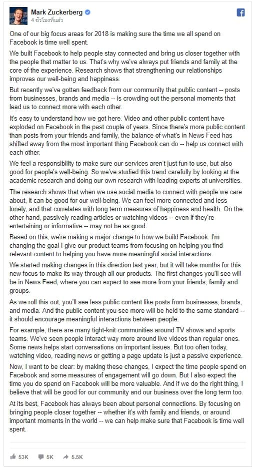 แน่นอนจะทำให้ ยอด Engagement ของแต่ละเพจมีแนวโน้มลดลง แต่ผู้ใช้มีความสุขจากการติดตามเพื่อนๆบน facebook มากขึ้น