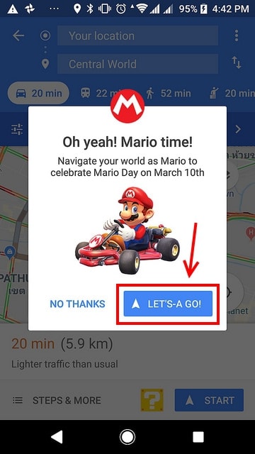 จะขึ้นหน้า Pop-Up รูปมาริโอ ( Mario ) ขึ้นมา แบบว่า Oh Yeah! Mario Time แบบนี้ แล้วแตะที่ปุ่ม Let’s-A-GO! เพื่อเปลี่ยนจากตัวนำทางสีฟ้าๆ กลายเป็นตัวมาริโอ ( Mario ) นำทางให้นั่นเอง