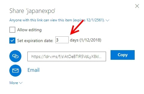 วิธีแชร์ลิงค์ไฟล์ OneDrive แบบกำหนดวันหมดอายุได้วันที่: 9 มกราคม 2018 by ไอที 24 ชั่วโมง หมวดหมู่: Microsoft, คำถามจากทางบ้าน, บทความไอที 24 ชั่วโมงFacebookแชร์XทวีตLINEส่งไลน์ บทความนี้เอาใจคนแชร์ไฟล์หนักๆที่เคยฝากไฟล์บน OneDrive เพราะตอนนี้ OneDrive สามารถแชร์โฟลเดอร์ให้เพื่อนๆโดยกำหนดวันหมดอายุแชร์ไฟล์ได้แล้ว ซึ่งทำได้ง่ายๆบนเว็บไซต์ Onedrive.com วิธีการคือ ก่อนอื่นเข้าเว็บไซต์ Onedrive.com ทำการ Login ด้วยบัญชี Microsoft ให้เรียบร้อย จากนั้นเลือกโฟล์เดอร์หรือไฟล์ที่ต้องการแชร์ให้เพื่อน แล้วเลือกที่ปุ่ม Share ดังรูป จะเปิดหน้าต่างรูปแบบการแชร์ ซึ่งคุณสามารถกำหนดวันหมดอายุการแชร์ให้เพื่อนได้ โดยติ๊กถูกที่ Set Expiration Date แล้วใส่จำนวนวัน ที่จะให้แชร์ตามต้องการ โดยสามารถกำหนดวันแชร์ได้สูงสุด 30 วัน แล้วสามารถเลือกรูปแบบแการแชร์ OneDrive ไปให้เพื่อน ทั้งทางอีเมล และแชร์ทางลิงค์ โดยหากหมดอายุตามวันที่กำหนดแล้ว ลิงค์นั้นก็จะไม่สามารถเข้าถึงไฟล์งานที่แชร์นี้ได้อีกต่อไป