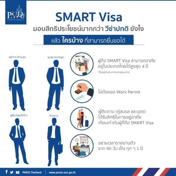 - ผู้ถือ SMART Visa สามารถอาศััยอยู่ในประเทศไทยได้สูงสุด 4 ปี (ขึ้นอยู่กับประเภทของกลุ่มบุคคล)