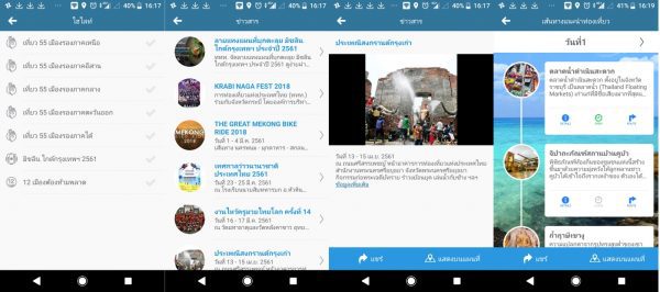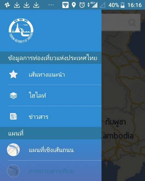 หลังจากเปิดแอปแล้วก็ลองเรียกเมนูด้านซ้ายจะเห็นรายการเมนูสำคัญต่างๆมากมายที่ออกแบบให้คุณ สามารถหาข้อมูล และวางแผนการเดินทาง ท่องเที่ยวไทยในสไตล์คุณ ที่ไม่ใช่แค่เฉพาะช่วงสงกรานต์เท่านั้น แต่ท่องเที่ยวได้ทุกวัน แม้วันธรรมดาก็เที่ยวได้