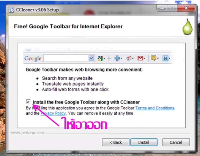และขณะติดตั้ง อย่าทำการ Next รวดเดียว ผู้สร้างโปรแกรมในบางครั้งจะมีโปรแกรมแถมมาอยู่ในไฟล์ติดตั้ง เช่น Google Toolbar ที่สร้างความเกะกะแต่ตัวเว็บเบราว์เซอร์มากขึ้น หรือแอปอื่นๆมาแถมให้อีก ให้เราเอาเครื่องหมายถูกเพื่อไม่ติดตั้งแอปอื่นๆนี้ลงคอมพิวเตอร์เรา