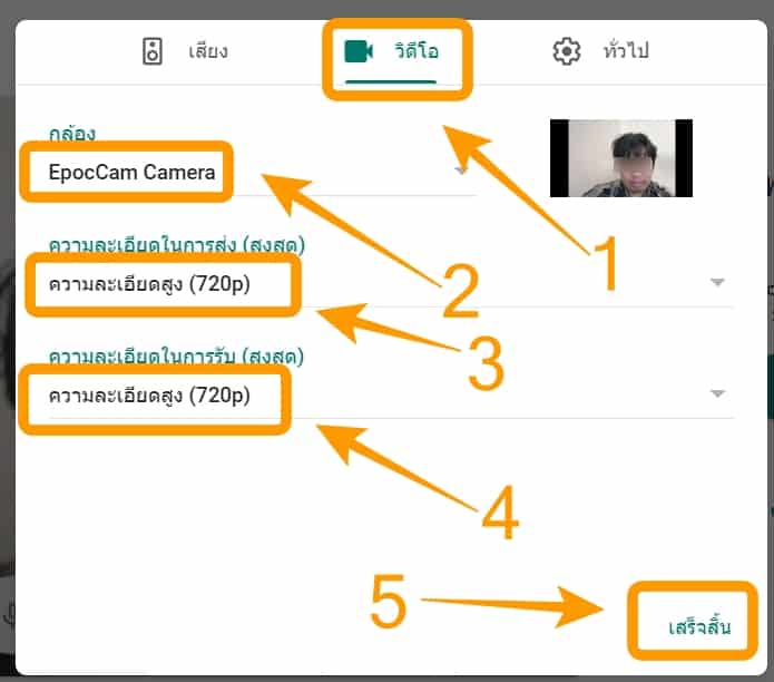ส่วนบนคอมพิวเตอร์ เปิดแอป Meet , Zoom , Skype แล้วเข้าไปที่ Settings ของแต่ละโปรแกรม แล้วเลือกการตั้งค่าจากเว็บแคมปกติ ไปเลือกที่ EpocCam (Device) แทน เพื่อเลือกการทำงานเว็บแคมจากกล้องมือถือที่เชื่อมกับคอม ณ ตอนนี้