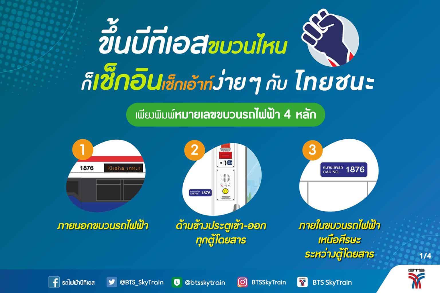 แม้จะยังไม่บังคับเช็คอินไทยชนะ แต่บีทีเอสขอความร่วมมือผู้โดยสารทุกท่านลงทะเบียน “ไทยชนะ” ซึ่งขั้นตอนจะต่างจากการเช็คอินไทยชนะด้วย QR-CODE และ แอปไทยชนะ โดยการเช็คอินนั้นสามารถเช็คอินผ่านทางแอป BTSSKYTRAIN , Line @BTSSKYTRAIN และเว็บไซต์ www.bts.co.th บนมือถือ ดังนี้