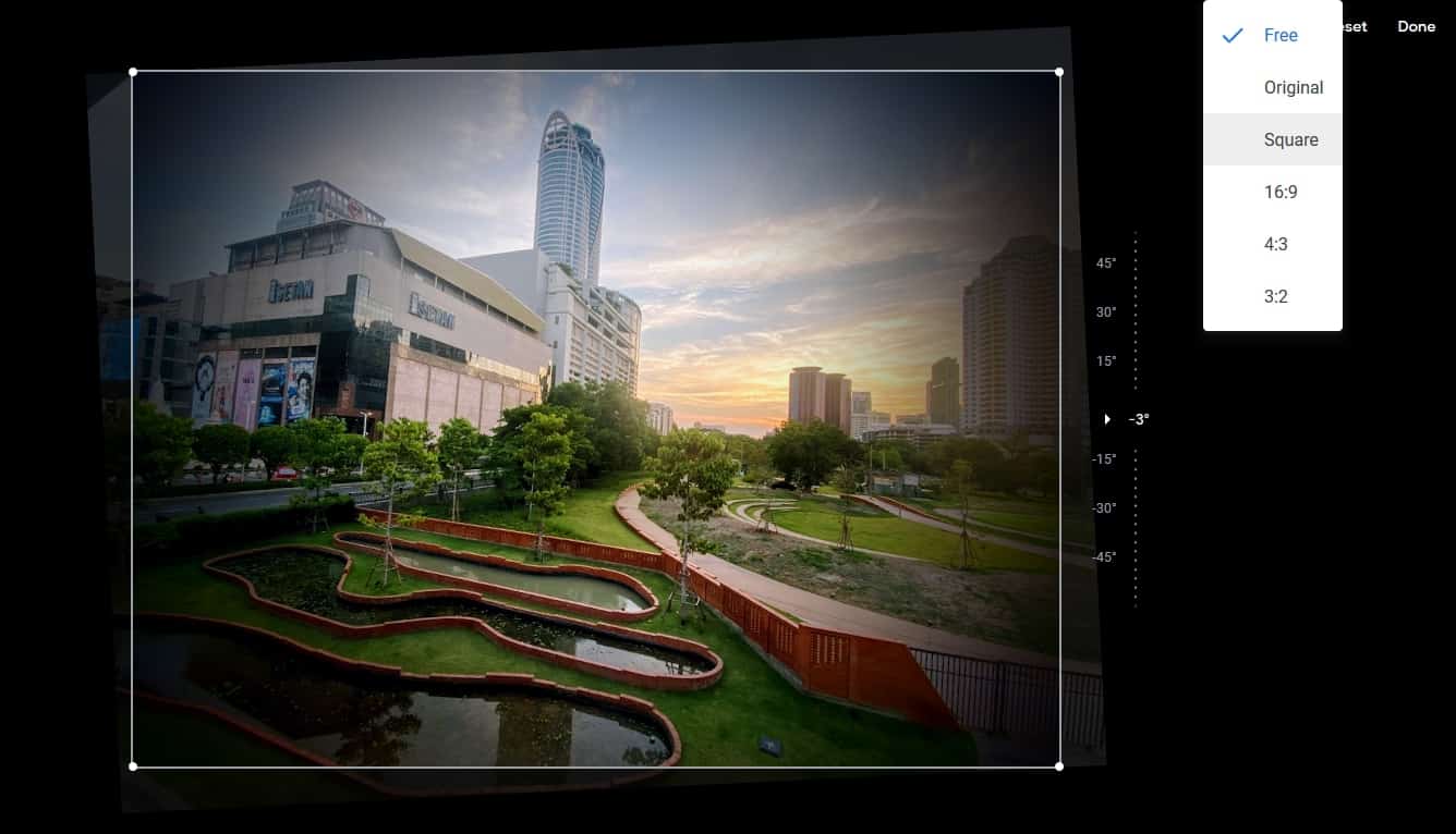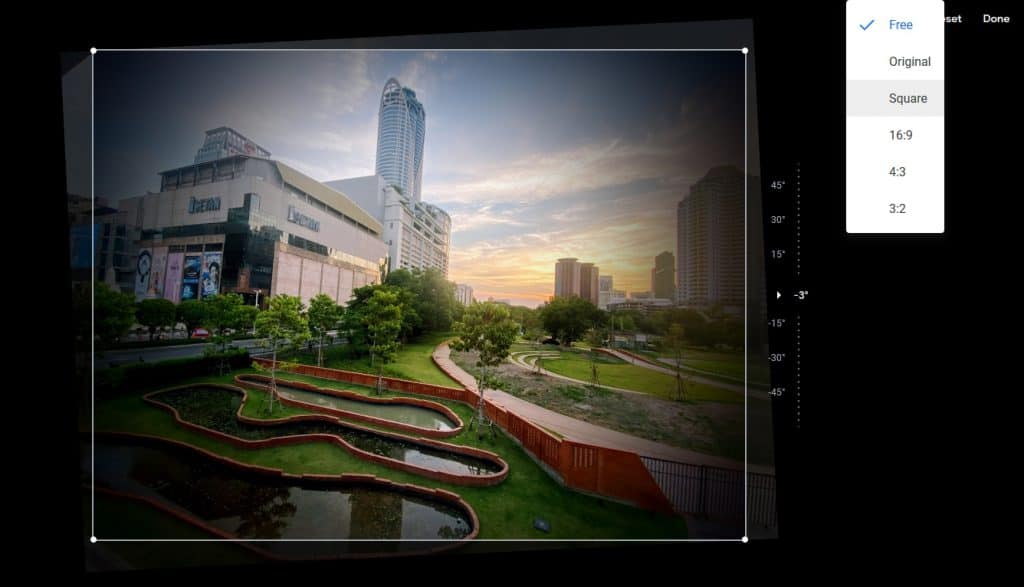 แท็บที่ 3 คือการครอปและการเอียงภาพ ในกรณีที่เราถ่ายเอียง สามารถกด auto เพื่อให้ทำการหมุนและครอบภาพให้เป็นภาพตรงได้ และสามารถครอปรูปภาพให้อยู่ในสัดส่วน 16:9 , square และขนาดอื่นๆได้ตามต้องการ หรือจะค่อยๆหมุนภาพให้ภาพเอียงที่พอดีก็ได้เช่นกัน