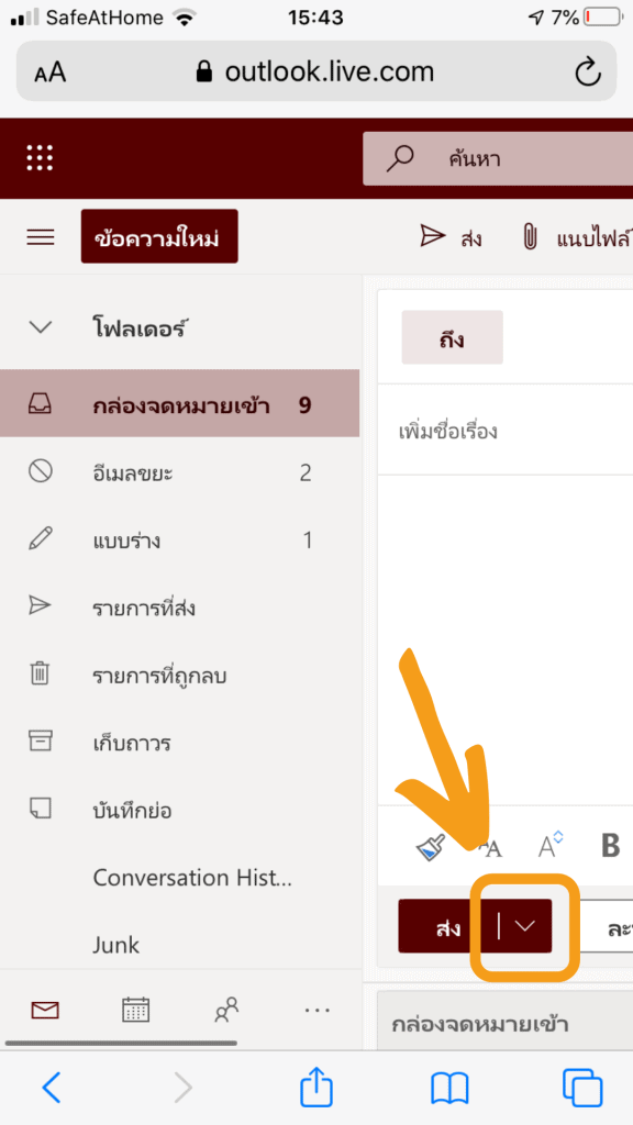 ขณะที่กำลังเขียนจดหมายอยู่ ข้าง ๆ ปุ่มที่มีคำว่าส่งจะมีสัญลักษณ์สามเหลี่ยมชี้ลงอยู่ แตะที่ปุ่มสามเหลี่ยมนั้น