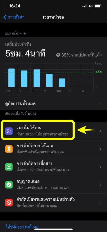 ทำการเปิดสวิตซ์ เวลาไม่ใช้งาน ให้เป็นสีเขียวดังรูป เพื่อเปิดใช้ฟีเจอร์นี้ จากนั้นเลือกว่าทุกวัน หรือกำหนดวัน และเลือกช่วงเวลาที่ไม่ใช้งาน เพื่อปิดกั้นไม่ให้ลูกใช้งานในช่วงเวลาดังกล่าว ในตัวอย่างนี้ ปิดไม่ให้ลูกใช้งาน 16.00-17.00น. เสร็จแล้วเลือก เวลาหน้าจอ เพื่อย้อนกลับและการตั้งค่ามีผลทันที