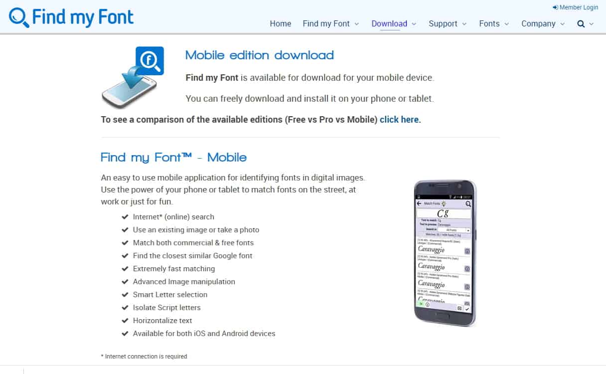 ก่อนอื่นโหลดแอปชื่อว่า Find my font ลงบนเครื่องมือถือ iPhone หรือ Android ก่อน โหลดได้ผ่านทาง App Store หรือ Play Store เช่นเคย หรือที่เว็บไซต์ https://www.findmyfont.com/download/download-mobile-edition ตามรูปบน ซึ่งจะมีลิงค์ไปยัง Play Store และ App Store อยู่