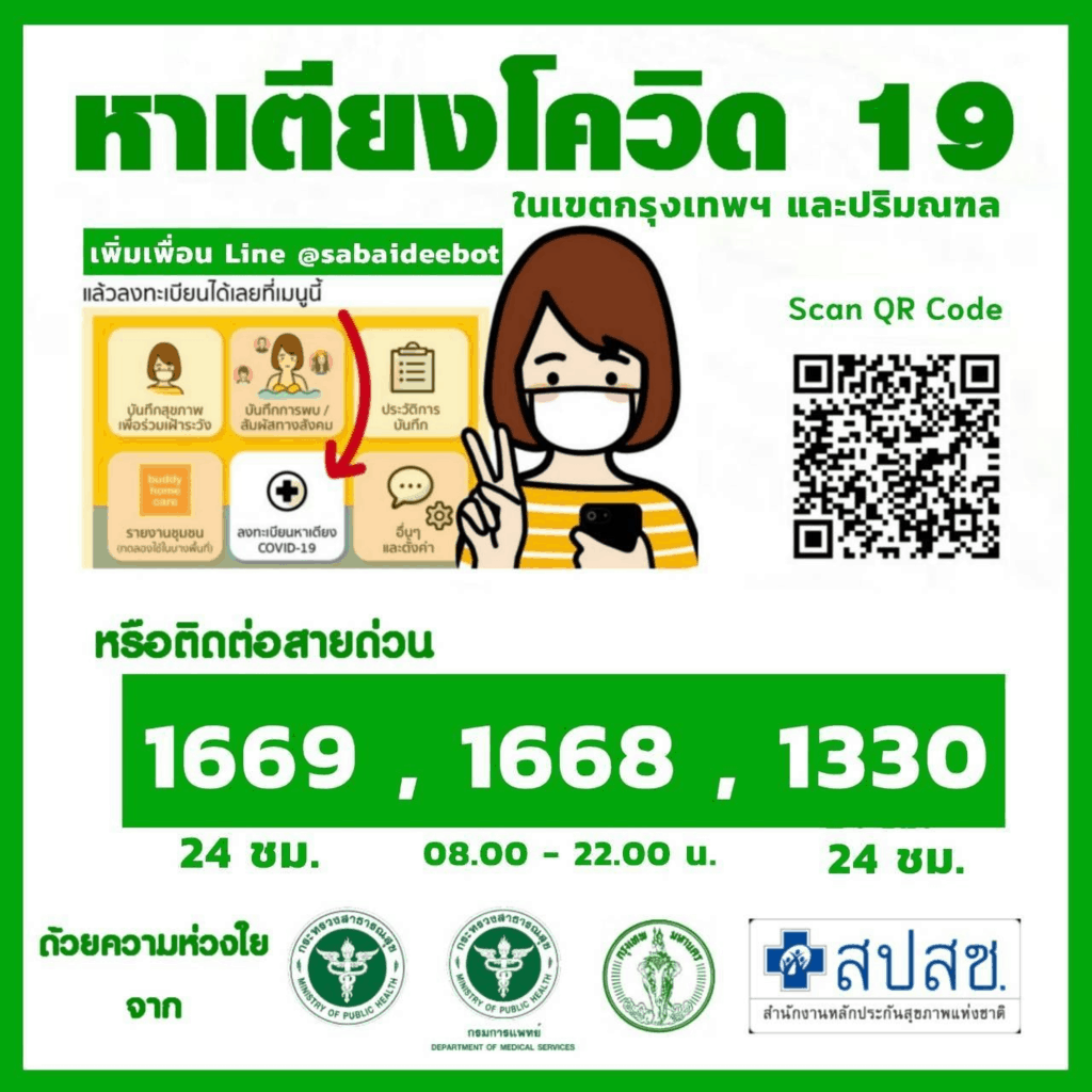 - 1668 เบอร์กรมการแพทย์ สำหรับประสานหาเตียงผู้ติดเชื้อโควิด-19 เปิดให้บริการเวลา 8.00-22.00น. ของทุกวัน*