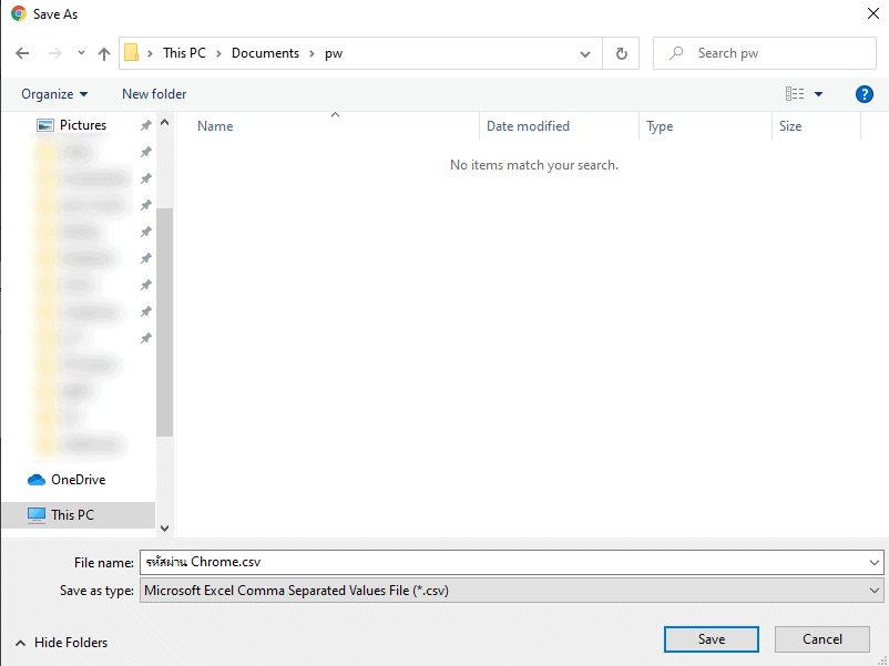 แล้วเลือก โฟลเตอร์ปลายทางที่จะบันทึกรหัสผ่าน chrome ไว้ แล้วคลิก save จะได้ไฟล์ CSV ซึ่งนำไฟล์นี้ไป Import กับโปรแกรม Password Manager อย่าง Lastpass หรือ 1password ได้