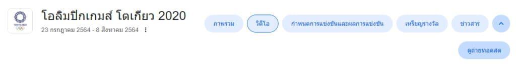 เพียงพิมพ์คำว่า โอลิมปิก , olympic , โตเกียว 2020 , tokyo 2020 ลงไปในช่องค้นหาของ Google จะแสดงหน้ารายงานผลการแข่งขัน และข่าวสารเกี่ยวกับ โอลิมปิก โตเกียว 2020 ด้านบนจะเป็นรายงานการแข่งขันแบบสดๆ แล้วด้านล่างจะเป็นข่าวล่าสุดจากสื่อต่างๆ ขณะที่ด้านขวามือจะแสดงเหรียญรางวัลโอลิมปิกล่าสุด โดยแสดงเป็นรายประเทศ กับ เฉพาะนักกีฬาด้วย