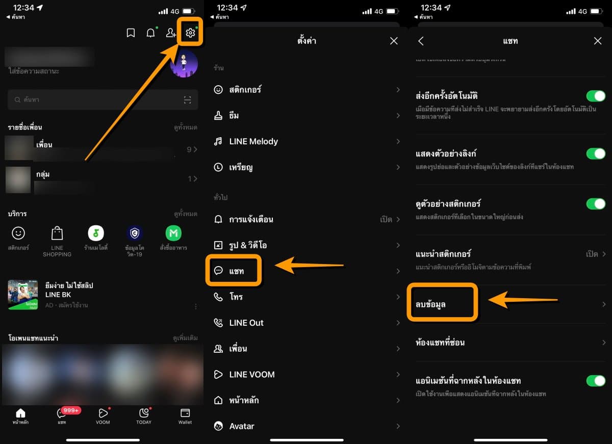 เปิดแอป LINE บน ไอโฟน จากนั้นแตะที่ไอคอนตั้งค่า เลือกที่ แชท ต่อด้วยเลือก ลบข้อมูล