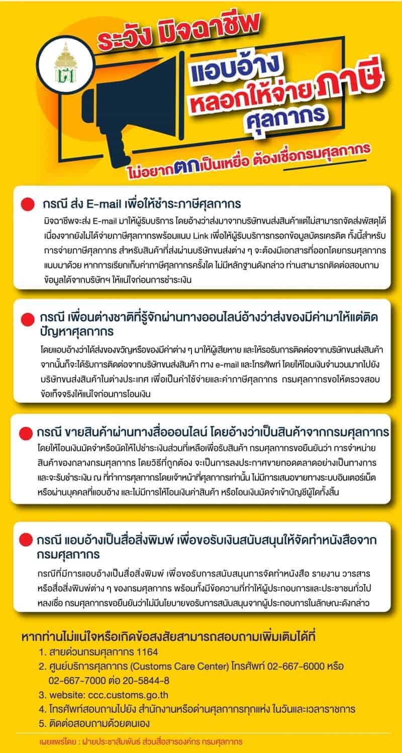 ระวังมิจฉาชีพส่งอีเมล แอบอ้างกรมศุลกากร หลอกให้จ่ายภาษี โดยมิจฉาชีพจะส่ง E-mail มาให้ผู้รับบริการ โดยอ้างว่าส่งมาจากบริษัทขนส่งสินค้าแต่ไม่สามารถจัดส่งพัสดุได้ เนื่องจากยังไม่ได้จ่ายภาษีศุลกากร พร้อมแนบ Link เพื่อให้กรอกข้อมูลบัตรเครดิตชำระเงิน ทั้งนี้ สำหรับการจ่ายภาษีศุลกากร สำหรับสินค้าที่ส่งผ่านบริษัทขนส่งต่าง ๆ จะต้องมีเอกสารที่ออกโดยกรมศุลกากรแนบมาด้วย หากการเรียกเก็บค่าภาษีศุลกากรครั้งใด ไม่มีหลักฐานดังกล่าว ท่านสามารถติดต่อสอบถามข้อมูลได้จากบริษัทฯ ให้แน่ใจก่อนการชำระเงิน