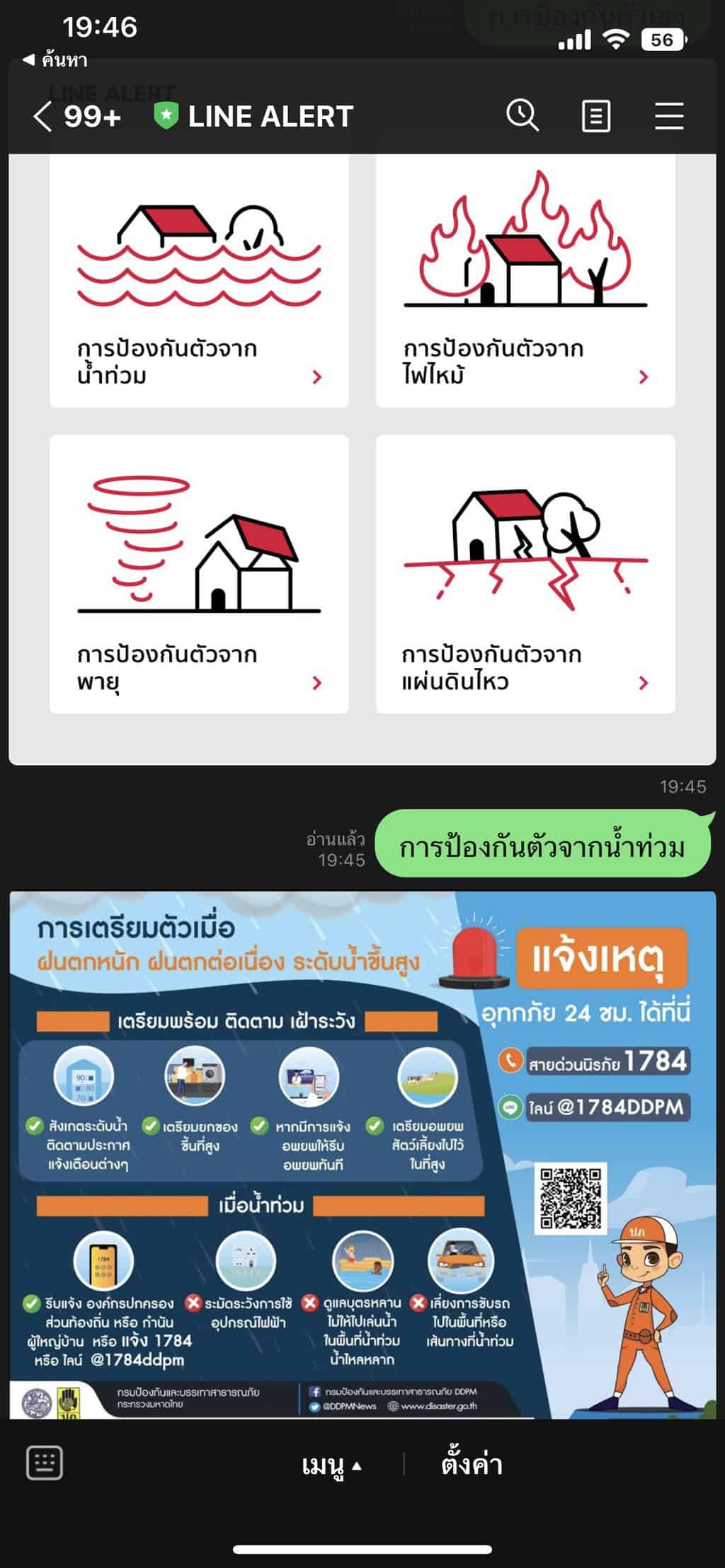 จะเข้าสู่หน้าจอนี้ LINE ALERT พร้อมทำงานแจ้งเตือนภัยพิบัต และรายงานสถานการณ์ภัยพิบัตที่เกิดขึ้นในไทยแล้ว ลองแตะที่เมนู