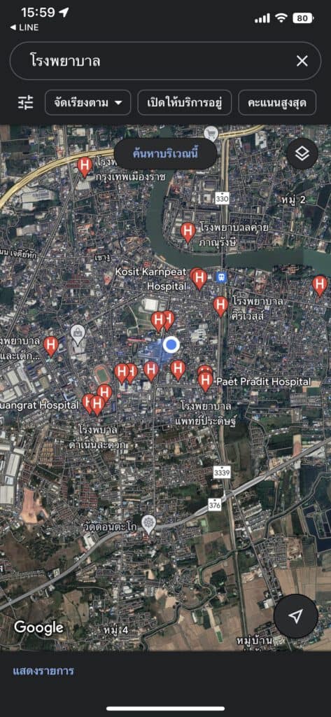 โรงพยาบาลใกล้เคียง จะแสดงแผนที่ Google Maps โชว์โรงพยาบาลใกล้เคียงเพื่อเข้ารับการช่วยเหลือหรือรักษาที่โรงพยาบาลที่ใกล้ที่สุด