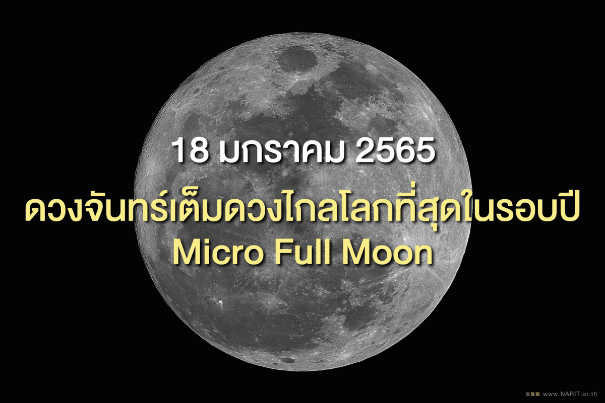 ชวนชมดวงจันทร์เต็มดวงไกลโลกที่สุดในรอบปี 2565 “ไมโครฟูลมูน” (Micro Full Moon) ระยะห่างจากโลกประมาณ 401,011 กิโลเมตร วันที่ 18 มกราคมนี้ โดยดวงจันทร์เต็มดวงมีขนาดปรากฏเล็กกว่าปกติเล็กน้อย สังเกตการณ์ได้ตลอดคืนเป็นคืนจันทร์เต็มดวงที่ดวงจันทร์จะโคจรอยู่ในระยะไกลโลกมากที่สุดในรอบปี ระยะห่างจากโลกประมาณ 401,011 กิโลเมตร เริ่มสังเกตดวงจันทร์ได้ด้วยตาเปล่าทางทิศตะวันออก หลังดวงอาทิตย์ลับขอบฟ้า เวลาประมาณ 18:30 น. เป็นต้นไปจนถึงรุ่งเช้า