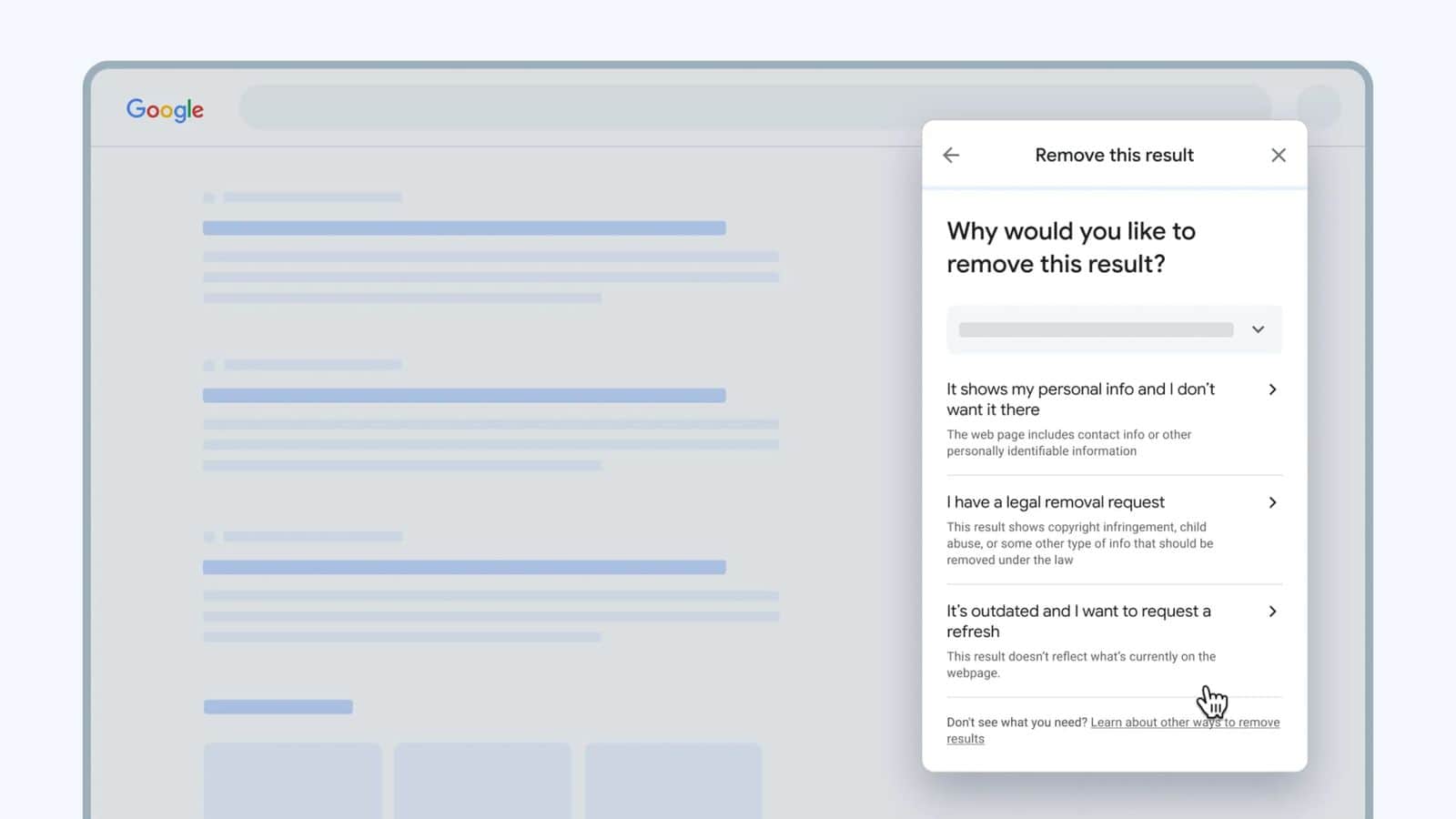 - “แสดงข้อมูลส่วนตัวของฉัน” It shows my personal info : ตัวเลือกนี้ช่วยให้ผู้ใช้สามารถขอให้กูเกิลลบข้อมูลส่วนตัว เช่น หมายเลขโทรศัพท์ ที่อยู่อีเมล ที่อยู่บ้าน หมายเลขบัตรเครดิต ข้อมูลการเข้าสู่ระบบ และอื่นๆ หากผู้ใช้เลือกตัวเลือกนี้ Google จะตรวจสอบคำขอและพิจารณาว่าจะลบผลการค้นหานั้นหรือไม่