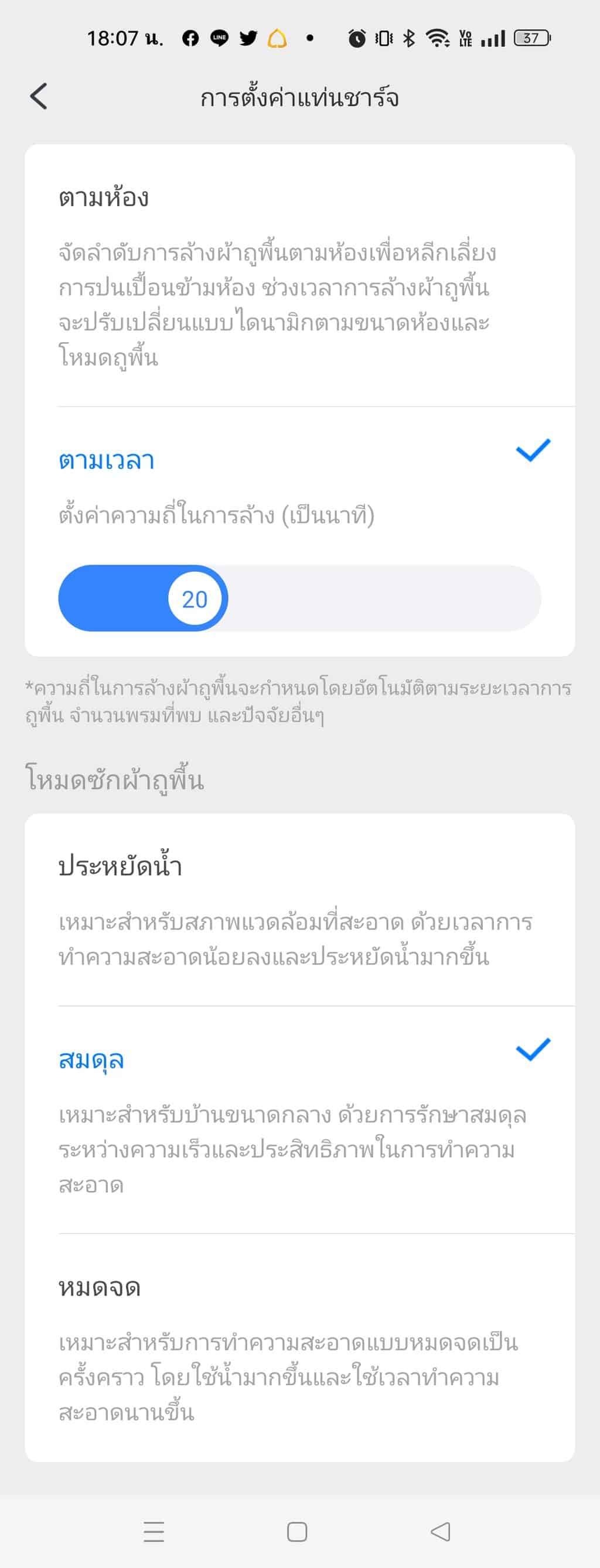 ซึ่งตัวแอปฯ เองก็ได้แนะนำความเหมาะสมของเวลาในการซักผ้าถูของแต่ละโหมดไว้เรียบร้อยแล้ว ทั้งนี้ตัวแอปฯ ยังมีฟังก์ชั่น การล็อกปุ่มป้องกันเด็ก การบำรุงรักษา การปรับเสียงหุ่นยนต์ และอื่นๆ อีกมากมาย