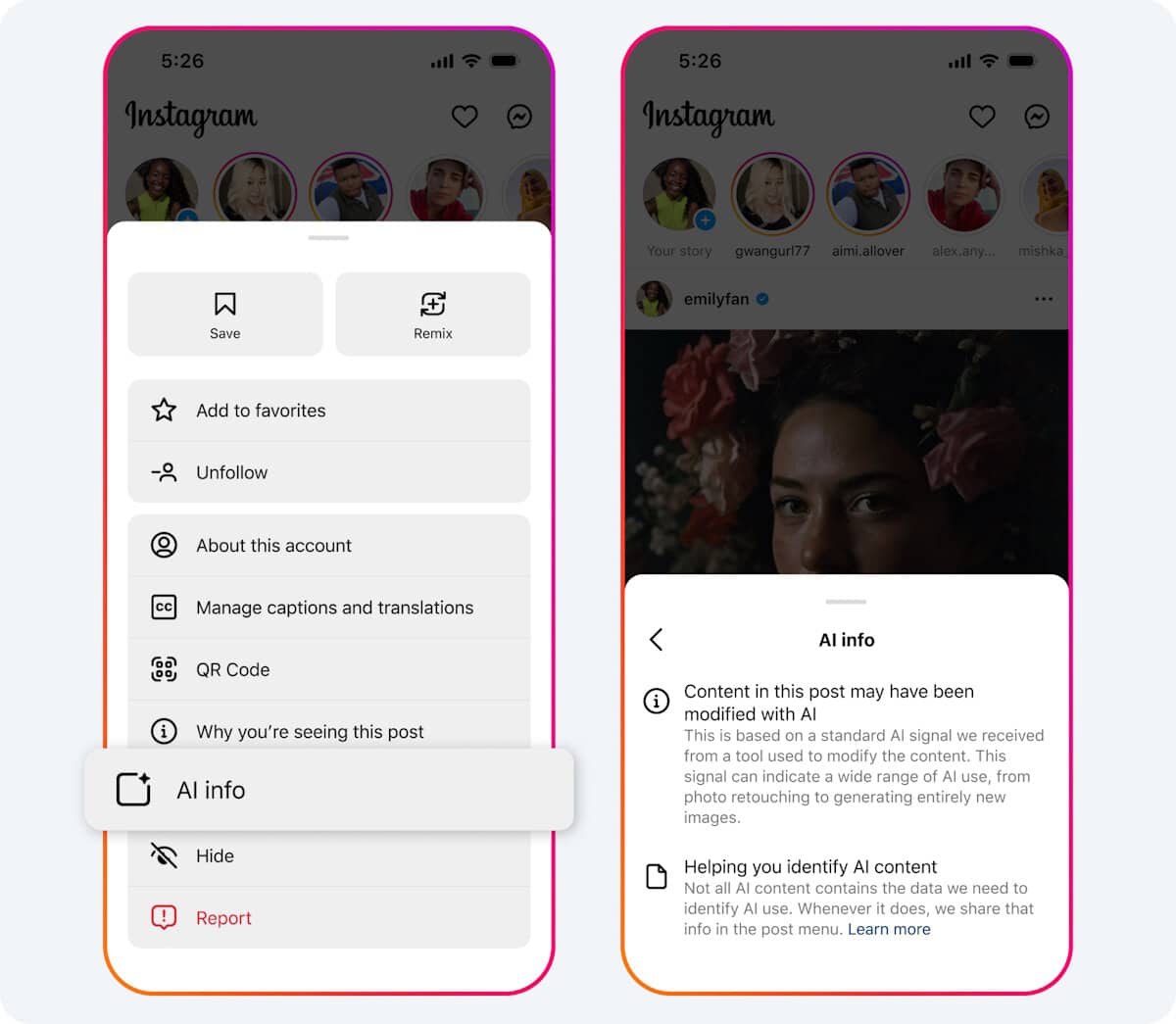 ปัญหาคือบางเนื้อหาถูกแก้ไขเพียงเล็กน้อยด้วย AI เช่น เครื่องมือปรับแต่งภาพ แต่ก็ยังถูกติดฉลากว่า “Made with AI” เพื่อให้ชัดเจนยิ่งขึ้นสำหรับผู้ใช้ Meta จึงตัดสินใจเปลี่ยนฉลาก “Made with AI” เป็น “AI info” บนแอปทั้งหมด