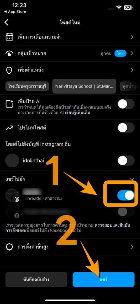 เข้าสู่หน้าก่อนโพสต์บน IG แล้วให้เลือกสวิตซ์เปิด ที่ Theads ในส่วนหมวด แชร์ไปยัง เพื่อแชร์โพสต์ IG พร้อมกับโพสต์ลง Threads บนอัตโนมัติ แล้วแตะแชร์